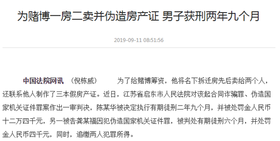 来源:中国法院网《为赌博一房二卖并伪造房产证 男子获刑两年九个月》