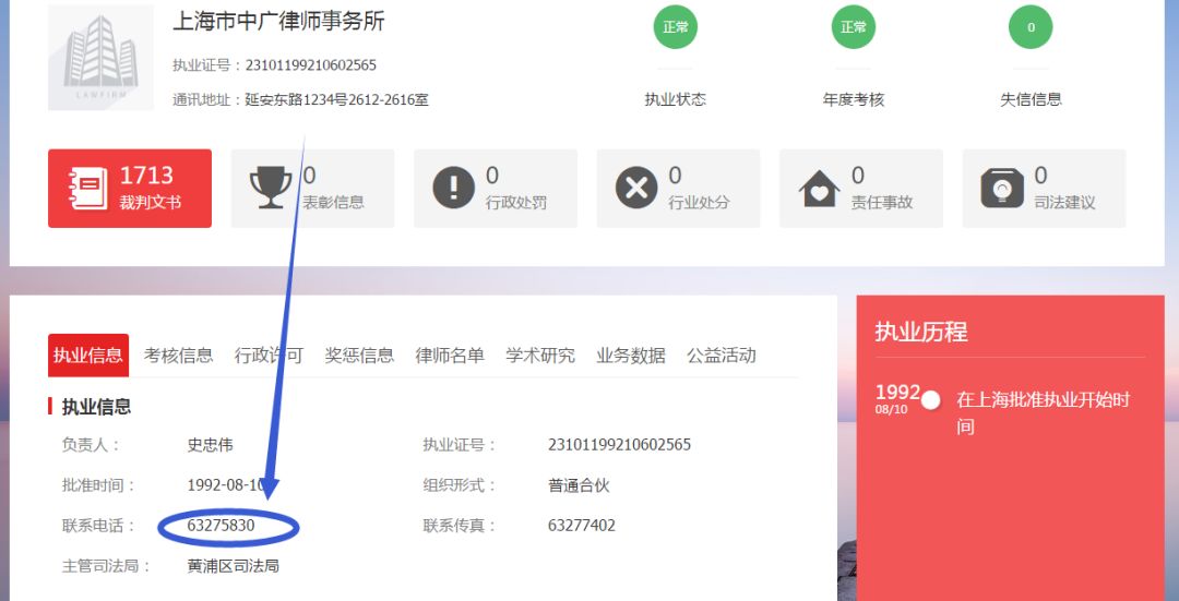 直接点进律所的页面,找到律师事务所的详细信息,按规定,这个页面都会有律所的联系电话的,直接用手机打过去(如果是座机号,记得带上当地的区号,比如图中这个应该拨打:021-63275830),报一下姓名、身份信息查询案件是否真的存在。如果是具体的某个律师负责,可以让接电话的人帮忙转接一下。