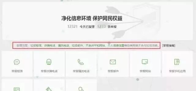 (1)举报短信;(2)举报诈骗电话;(3)举报骚扰电话;(4)举报垃圾邮件;(5)举报骚不良网站;(6)举报不良手机应用;(7)举报个人信息泄露;(8)举报短信/电话轰炸;(9)举报手机卡实名制问题。