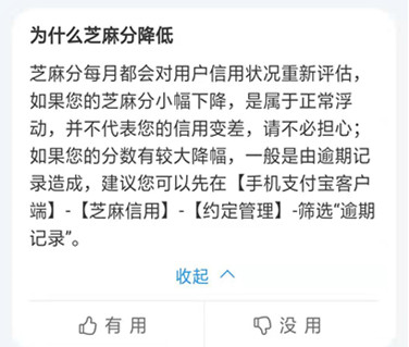 小编询问了支付宝客服,对方给出的答案是一般芝麻分降幅较大,都是由出现逾期记录造成的。