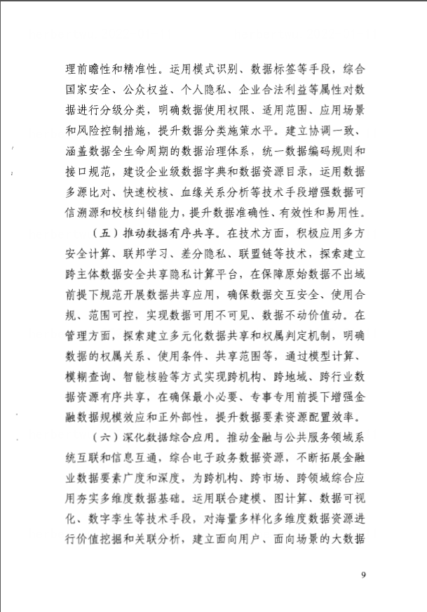 在数据共享方面,《规划》要求,推动数据有序共享。在技术方面,积极应用多方安全计算、联邦学习、差分隐私、联盟链等技术,探索建立跨主体数据安全共享隐私计算平台,在保障原始数据不出域前提下规范开展数据共享应用,确保数据交互安全、使用合规、范围可控,实现数据可用不可见、数据不动价值动。在管理方面,探索建立多元化数据共享和权属判定机制,明确数据的权属关系、使用条件、共享范围等,通过模型计算、模糊查询、智能核验等方式实现跨机构、跨地域、跨行业数据资源有序共享,在确保最小必要、专事专用前提下增强金融数据规模效应和正外部性,提升数据要素资源配置效率。