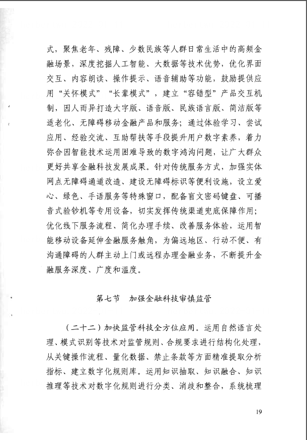 在弥合数字鸿沟方面,《规划》要求,强化金融无障碍服务水平。针对智能服务方式,聚焦老年、残障、少数民族等人群日常生活中的高频金融场景,深度挖掘人工智能、大数据等技术优势,优化界面交互、内容朗读、操作提示、语音辅助等功能,鼓励提供应用"关怀模式""长辈模式",建立"容错型"产品交互机制,因人而异打造大字版、语音版、民族语言版、简洁版等适老化、无障碍移动金融产品和服务;通过体验学习、尝试应用、经验交流、互助帮扶等手段提升用户数字素养,着力弥合因智能技术运用困难导致的数字鸿沟问题,让广大群众更好共享金融科技发展成果。