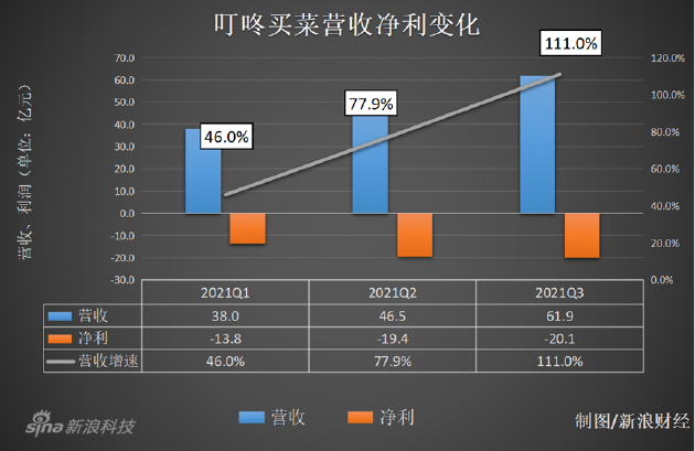 虽然GMV和营收保持快速增长,但叮咚买菜一直处于大幅亏损的状态。2019年叮咚买菜的净亏损为18.7亿元,而2020年的净亏损为31.8亿元;2021年前三季度,叮咚买菜的净亏损分别为13.8亿元、19.4亿元和20.1亿元。