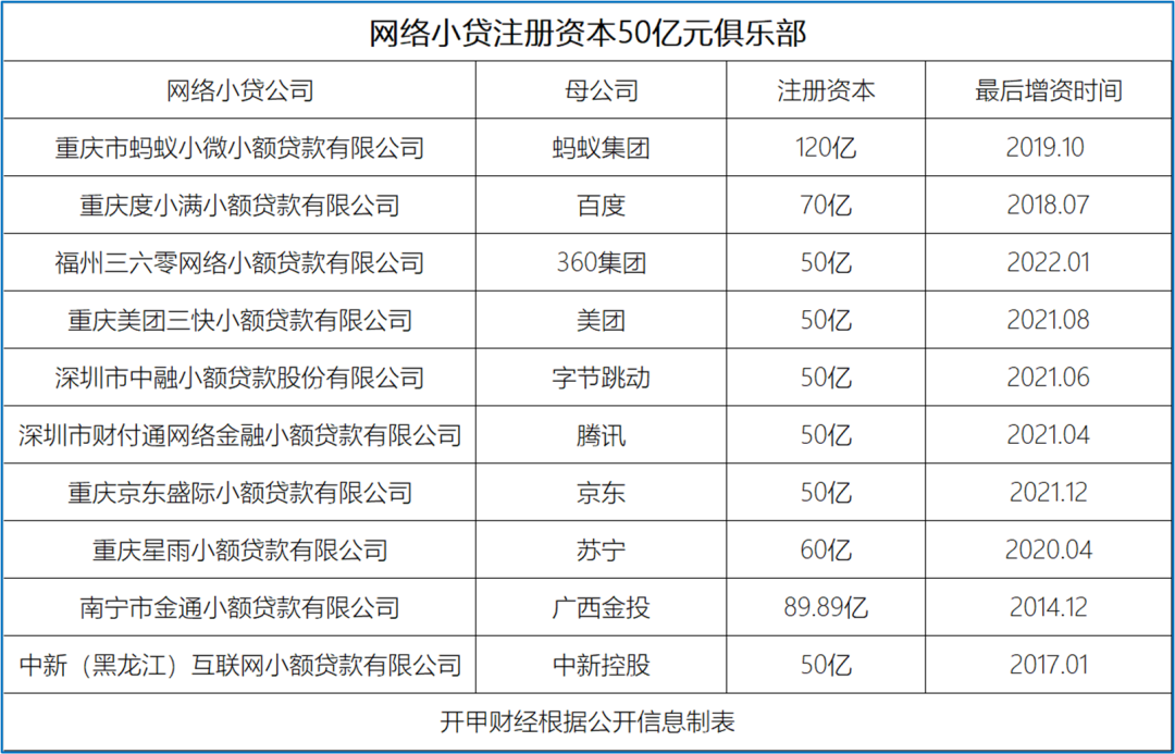 最早冲刺50亿注册资本金的互联网巨头是蚂蚁金服。2018年2月,重庆市蚂蚁小微小额贷款有限公司将注册资本从20亿元增至80亿元,正式迈入“50亿元俱乐部”。2019年10月,蚂蚁小微小贷进一步将注册资本提升至120亿元。