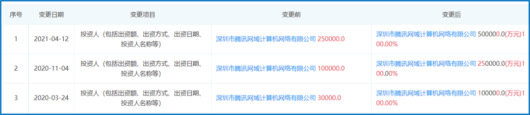 2021年4月12日,腾讯旗下的深圳市财付通网络金融小额贷款有限公司注册资本从25亿元增至50亿元;值得注意的是,2020年,财付通连续两次提升注册资本。2020年3月2日,财付通将注册资本从3亿元提升至10亿元;2020年11月4日,也就是蚂蚁集团IPO被叫停的第二天,财付通将注册资本从10亿提升至25亿元。