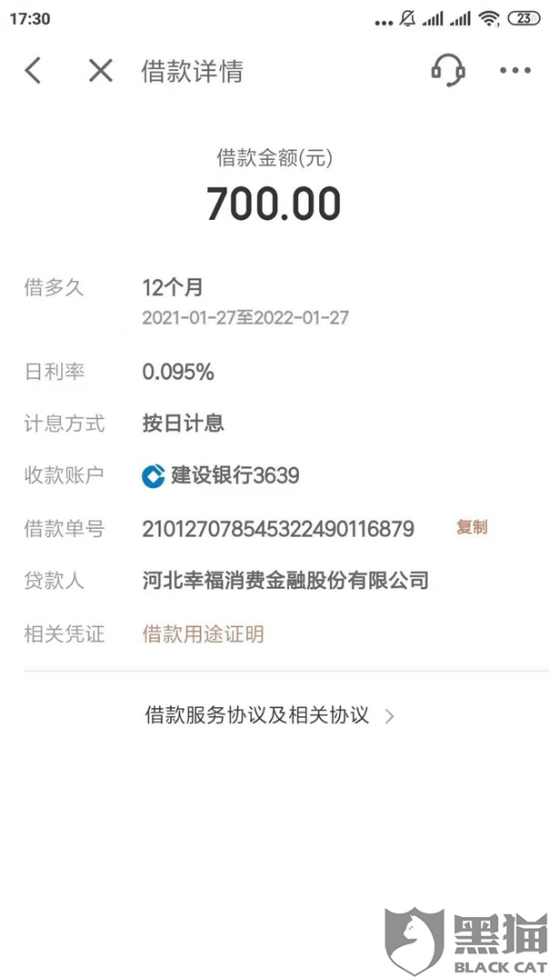 然而,根据黑猫平台网友发帖反馈,其在京东金条申请借款700元,放款方为幸福消费金融,贷款日利率0.095%,折合年利率为35%。