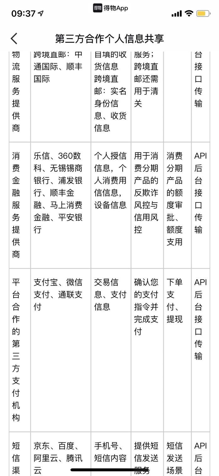 对于当前佳物分期的合作机构,得物官网和APP未明确提及,记者通过查看其公示的《第三方合作个人信息共享》清单发现,在消费金融服务提供商一栏,共有乐信、360数科、马上消费金融、顺丰金融、平安银行等7家机构,信息使用的场景为“消费分期产品的额度审批、额度支用”;平台合作的第三方支付机构为支付宝、微信支付、联通支付,使用场景为下单支付、提现。