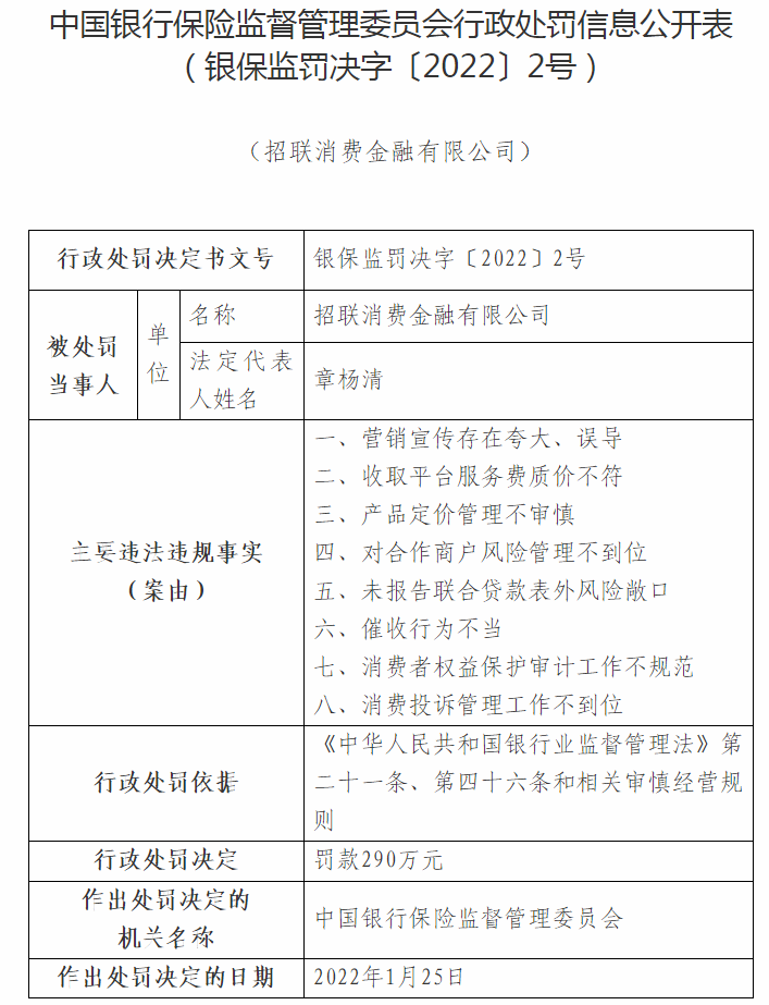 2月8日,据央视新闻报道,记者从中国银保监会消费者权益保护局了解到,因营销宣传存在夸大、误导;收取平台服务费质价不符;产品定价管理不审慎;对合作商户风险管理不到位;以及催收行为不当等八项违规行为,银保监会消费者权益保护局决定对招联消费金融有限公司给予行政处罚290万元。