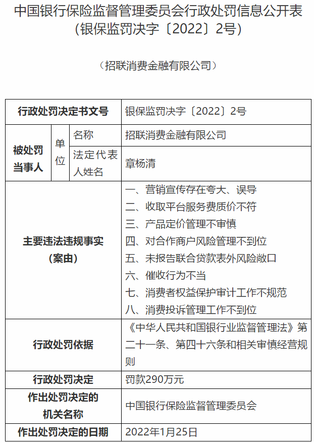 2月8日,银保监会官网公布了2022年第二张罚单,行政处罚对象为招联消费金融,主要违规行为共8项,行政处罚决定为罚款290万元。