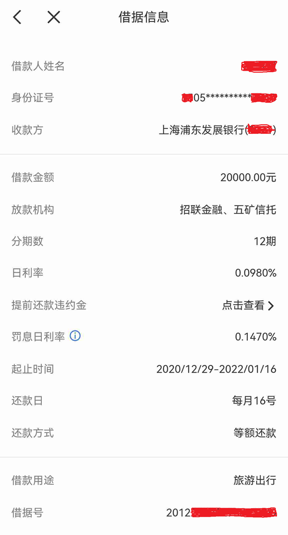 然而,根据网友在黑猫平台发帖显示,其2020年12月底在招联金融借款2万元,分12期,借款日利率0.098%(年利率为35.77%),罚息利率0.147%(年利率为53.66%),放款机构为招联金融、五矿信托,借款用途为“旅游出行”。