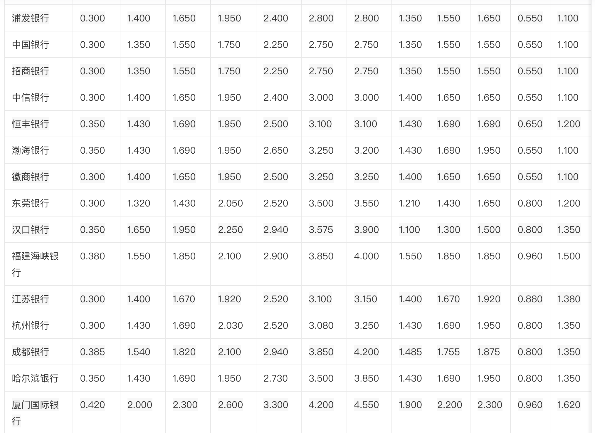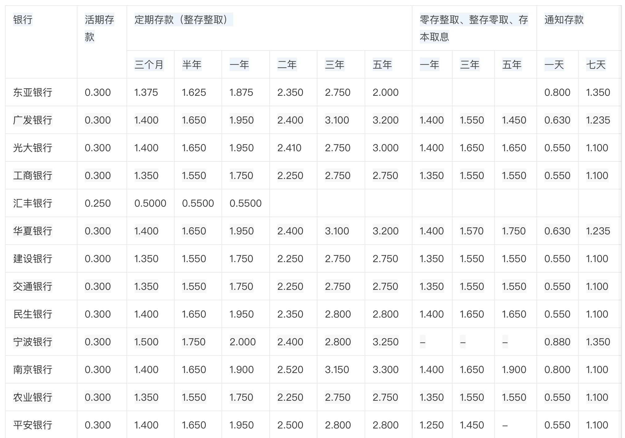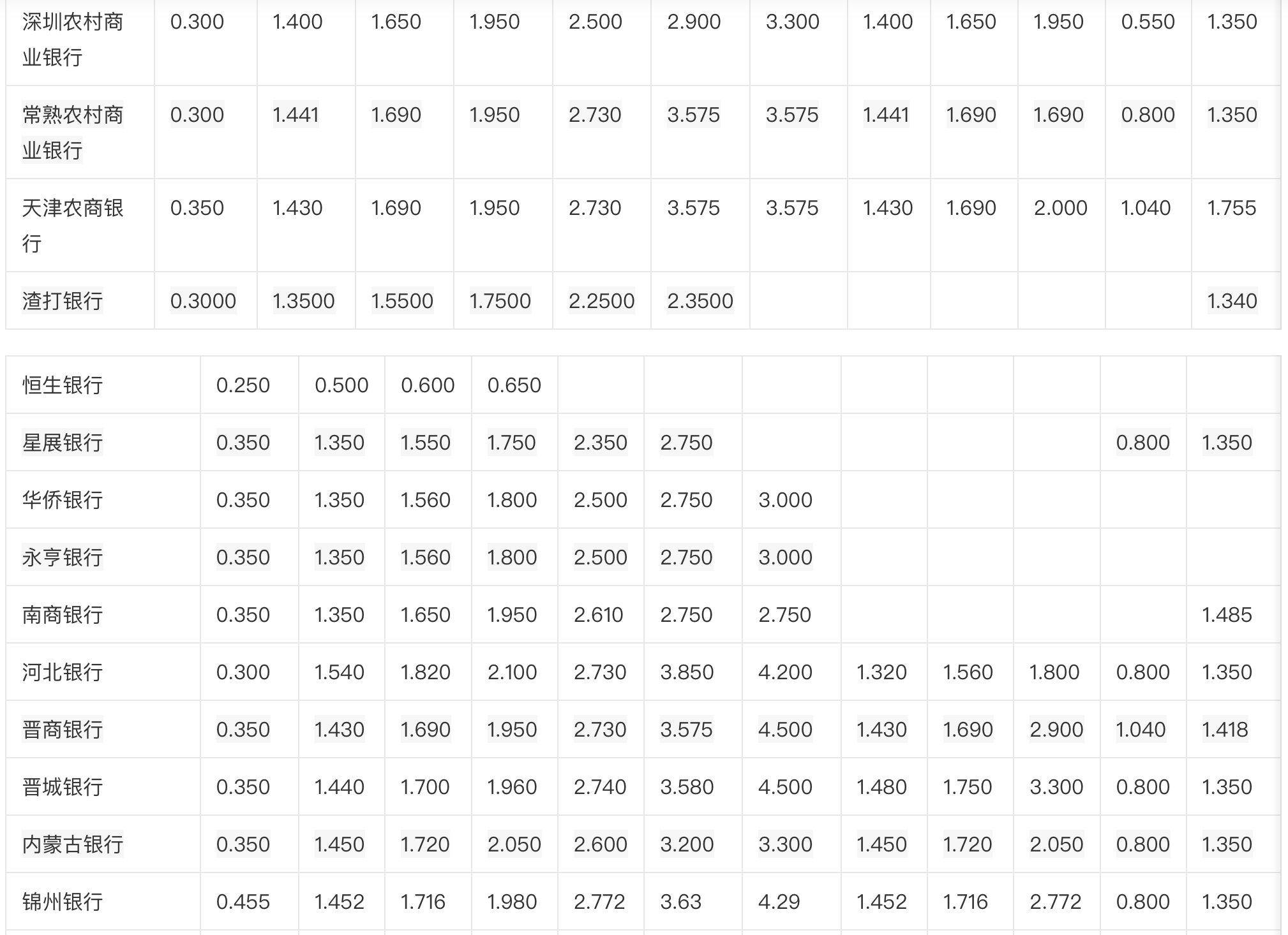 银行调整人民币存款新利息:2022年02月,各类银行存款最新利息表 2022-02-09 16:13:04 2022年02月,国内各类银行存款全新利息表 各类银行人民币存款利率表 注:官网的利率和实际当地银行执行的利率可能会有点差别,所以以上利率仅供参考,具体详情请咨询各银行网点柜台,不做任何建议,以当地各银行营业厅公布的利率为准 你也可能喜欢 详解15家全国性银行碳减排贷款:加权平均利率3.98%,6家国有行放款占比超七成 取消“认房又认贷”、增加公积金贷款额度……多地出台房地产新政 银行放贷节奏如何变化? 银保监会:P2P网贷机构全部停运 未兑付借贷余额压降到4900亿元 多家支付机构关联公司被吸纳为支付清算协会新会员,杉德支付关联方杉付通为多家无资质放贷平台导流,相关平台被指收取高额砍头息或违法