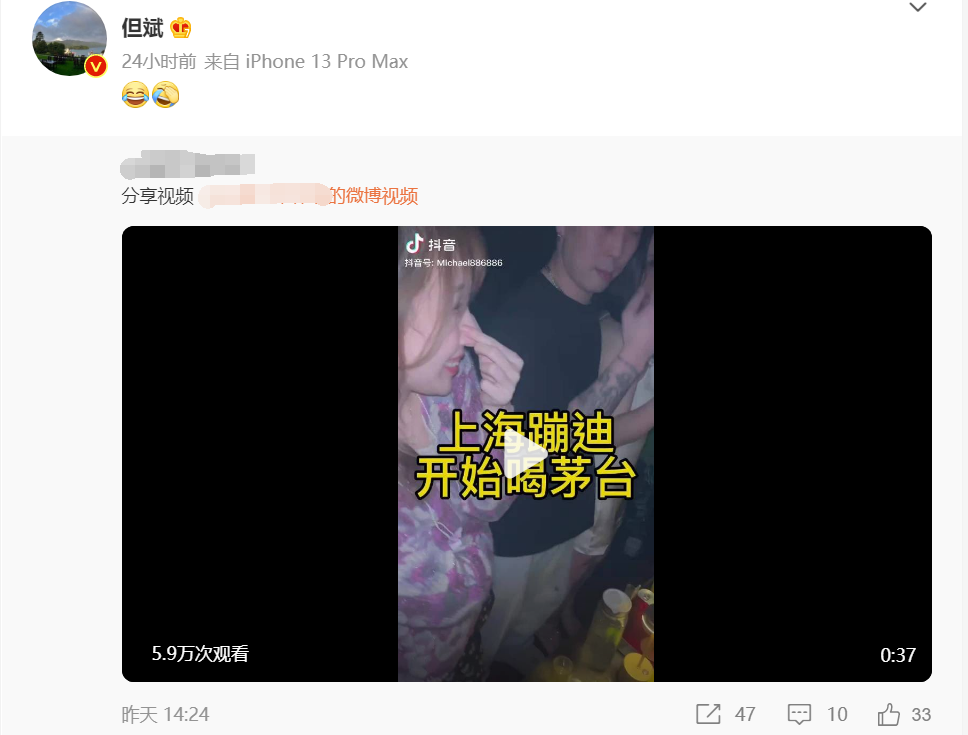 2月2日,一条“茅台配香槟让人上头”的抖音视频发布后得到了一定的关注度,发布者配文称:“虎年上海蹦迪!我们都喝茅台!来偶遇”。该视频2月9日被私募大佬但斌转发后在微博收获了五万点击量。