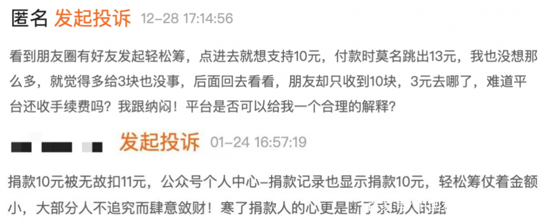 在黑猫投诉上,与李明有相似经历的用户并不鲜见。不少用户投诉称,其在轻松筹平台上向病患进行捐款时,却在不知情的情况下被额外扣取1-3元的费用。