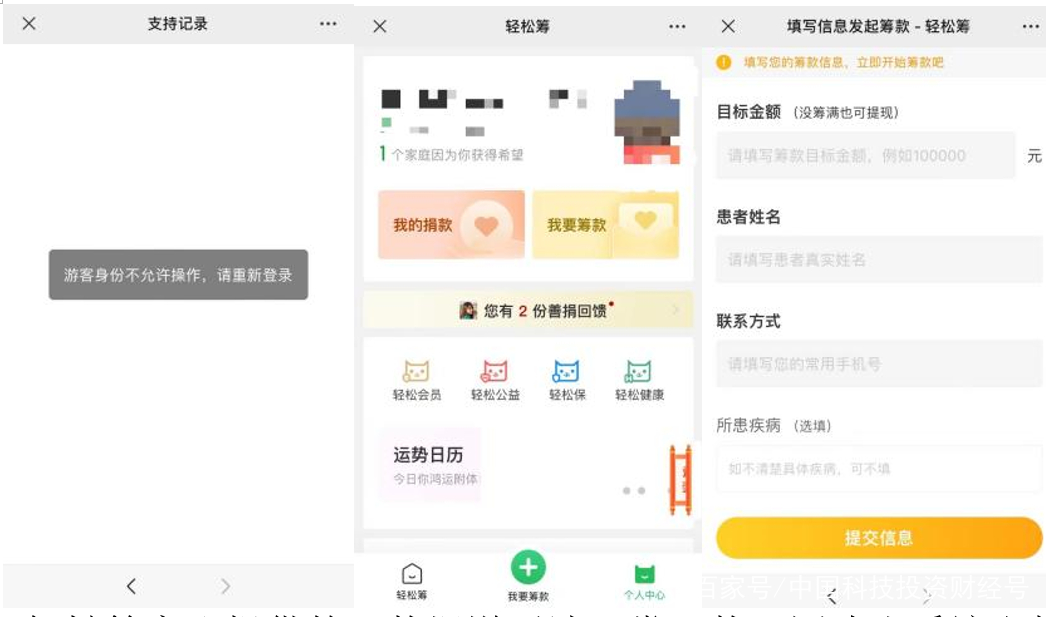 随后,李明按照轻松筹客服提供的退款渠道进行操作,却发现退款页面无法正常进入,点击“我的捐款”则弹出“游客身份不允许操作,请重新登陆”的提示,其通过换手机登陆、多次刷新登陆等方式均未能顺利进行退款。而当李明点击右侧的“我要筹款”选项,则可以正常流畅地进入筹款界面。李明告诉记者,“轻松筹虽然给出了退款渠道,却给退款设置重重阻碍,感觉像是在欺骗每一位爱心人士,以后不会在轻松筹平台上进行捐款,但还是希望真正需要帮助的人能得到帮助。”
