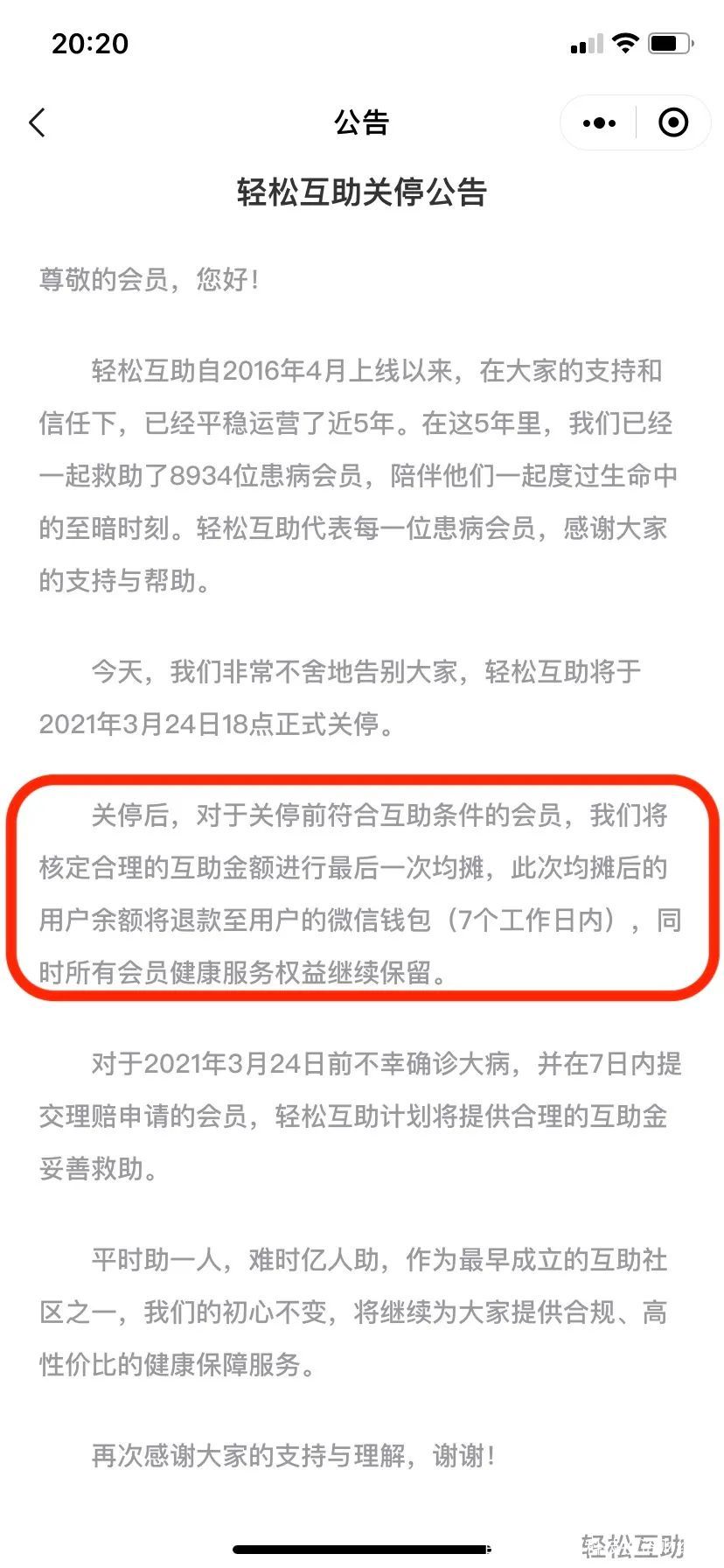 银保监会打非局明确将相互宝、轻松互助等网络互助平台定义为非持牌经营的非法商业保险活动。2021年3月24日,轻松互助平台正式宣布关停,并表示关停后将核定合理的互助金额进行最后一次均摊,此次均摊后的用户余额将在七个工作日内退款至用户的微信钱包。