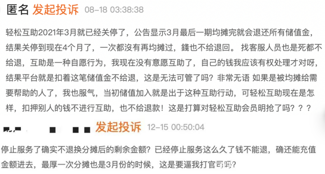 另外,2021年3月24日,轻松筹旗下的轻松互助平台即发布公告称,即日起停止互助服务,并于7个工作日内向用户退还其参与均摊后的账户余额。但目前仍有不少用户投诉称,该平台未向用户退还其账户中的全部余额。如此,留存在轻松互助的资金流向成谜。