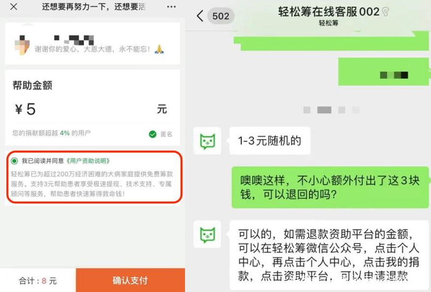 李明对此感到不解,随后向该公司客服进行咨询。轻松筹客服对此回复称,5元是捐给用户的,3元是助力平台的。平台未收取任何服务费用,也无误导支付之意,如您有爱心愿意帮平台继续运营,请留下您助力我们的费用,当然如您需要退费,请您在轻松筹公众号--个人中心--我的捐款--资助平台处申请退费。