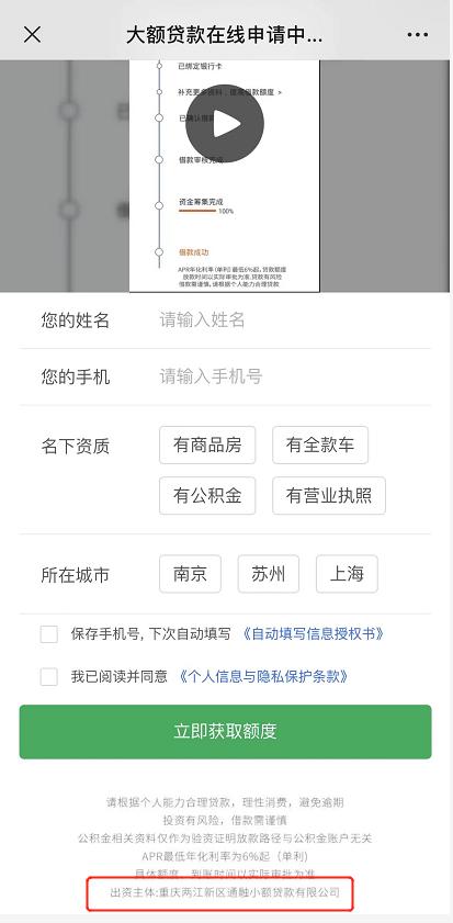 不过,随后向记者来电联系办理贷款的业务员却自称是一家上海公司“信审中心”的员工,帮记者匹配的资方是北京银行。对于广告页面显示的出资方通融小贷,该业务员称并不知晓。“我们好比是用户和机构之间的桥梁,目前只做银行的信用贷款和抵押贷款,小贷公司和网贷不做的。”