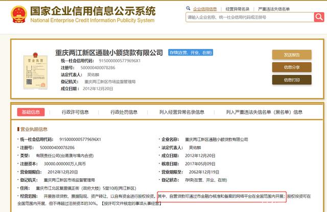 据悉,上文提及的重庆两江新区通融小额贷款有限公司是一家全国性互联网小贷公司。公开资料显示,通融小贷成立于2012年12月20日,法定代表人为吴佑麟,注册资本为3亿元。不过,记者注意到,工商信息经营范围一栏显示,通融小贷的自营贷款仅可“通过市金融办核准和备案的网络平台在全国范围内开展”。