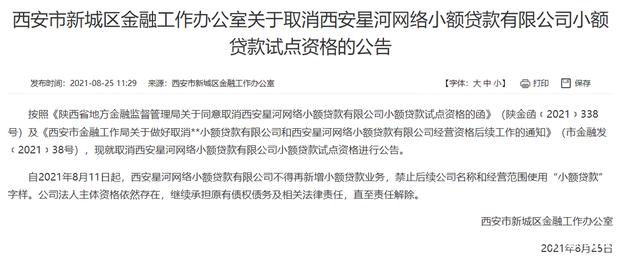 此外,广告称,放款资金由西安星河网络小额贷款有限公司提供。然而,记者查询发现,目前,西安星河网络小贷已被地方金融监管部门公告取消小额贷款经营资格,现更名为西安润来网络科技有限公司,并被列入经营异常名录。