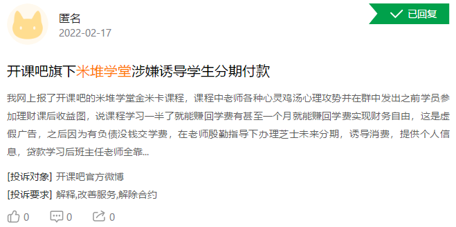 2月17日,有网友在黑猫平台发帖反馈,在抖音刷到米堆学堂1元理财课就报名了,上完7天的课,老师又推荐7988元的进阶课,并发出以前学员轻松赚回学费的图片,诱导消费,还让办理了分期付款,但老师上课都是复制粘贴,觉得课程质量很差,没有赚回学费,本人还是学生,虽然已还完贷款,但生活因此变得非常拮据,要求退款。