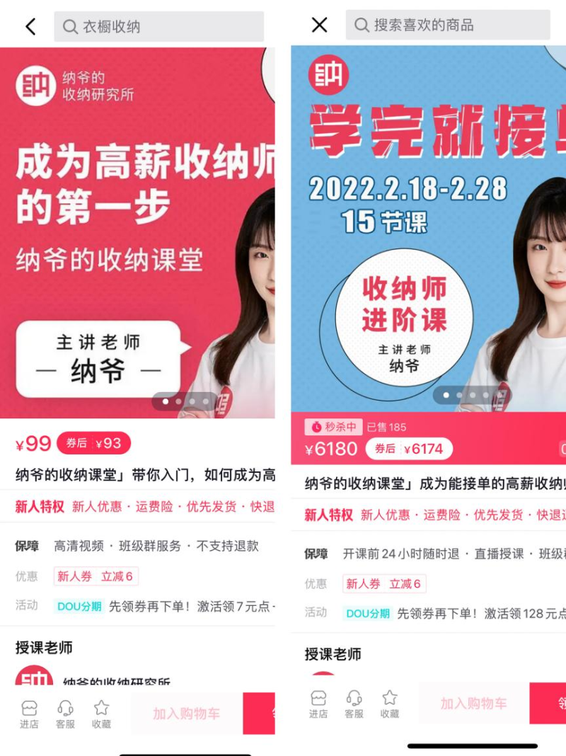 首先是个人收纳师培训,该类课程通常背靠网红整理收纳师,在社交媒体上有较大的流量优势,价格相对便宜。以“纳爷的收纳研究所”为例,其入门课分为11节,共70分钟,售价仅99元。若想进一步学习,可以购买其进阶课,共17课时,售价6980元,每节课时长在50-60分钟之间,形式主要为线上课程。