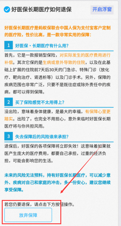 支付宝长期医疗怎么退保险? 2022-03-01 22:06:11 最佳答案: 支付宝长期医疗险退保步骤如下: 1、登录支付宝APP,点开我的,找到蚂蚁保险。 2、进入蚂蚁保险,找到我的客服。 3、在在线客服对话框输入,支付宝长期医疗险退保。 4、根据详情页操作,退保流程即可。 以上步骤操作环境: 手机型号:华为nova6 系统版本:HarmonyOS2.0.0 支付宝APP版本号:10.2.53 你也可能喜欢 办理年度汇算需要准备什么 钱存在银行卡里有利息吗 基金净值高适合买入吗 无业能申请房贷吗