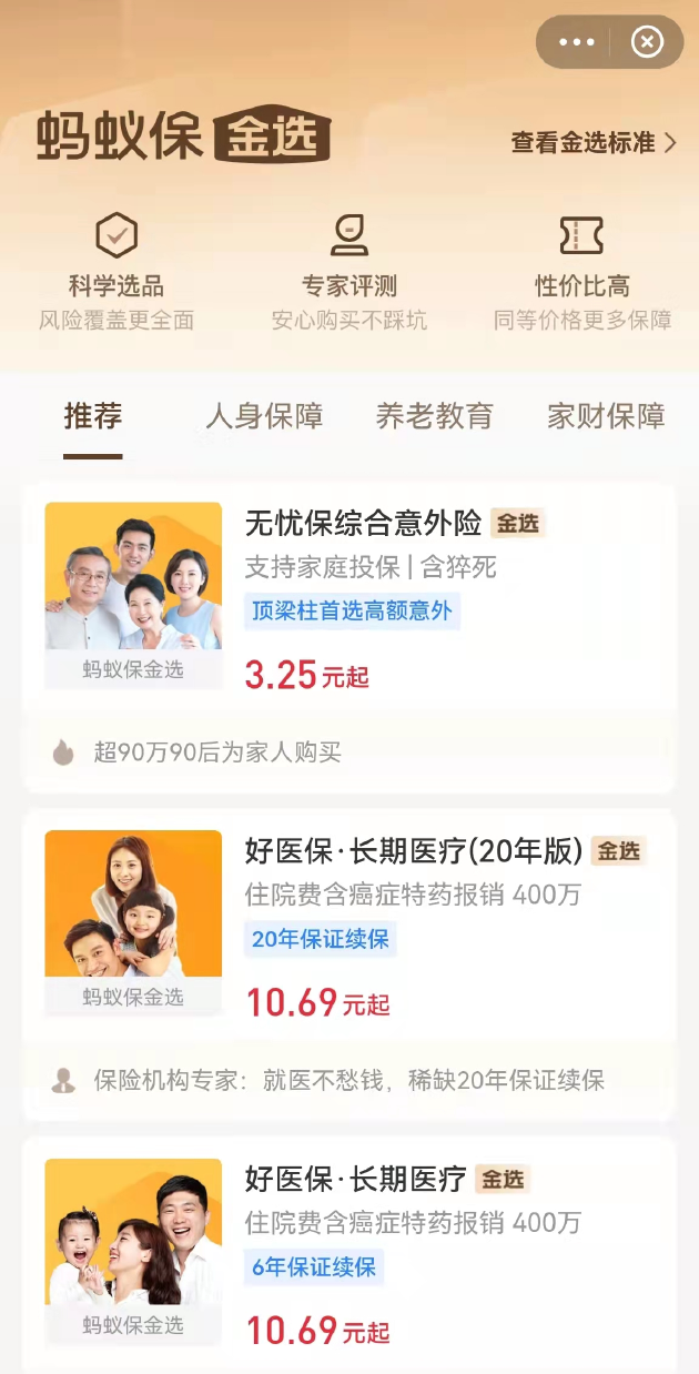 蚂蚁集团旗下蚂蚁保“金选”服务上线:首批入选产品共40余款