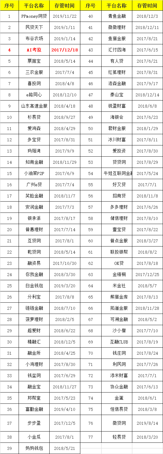 网贷天眼数据显示,新网银行合作存管P2P平台共77家,具体名单及存管时间如下: