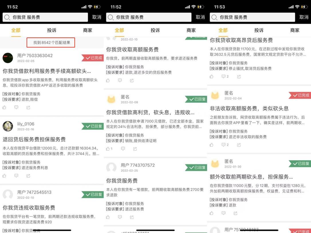 记者注意到,你我贷在黑猫投诉【投诉入口】平台的累计投诉量已经高达3.5万条,并仍在持续更新。而记者以“你我贷 服务费”在黑猫投诉平台搜索,匹配的结果竟达8542条。投诉中表达的信息包括但不限于:“下款前不知道有服务费”、“无明显告知”、“增加贷款成本”、“变相砍头息”等。