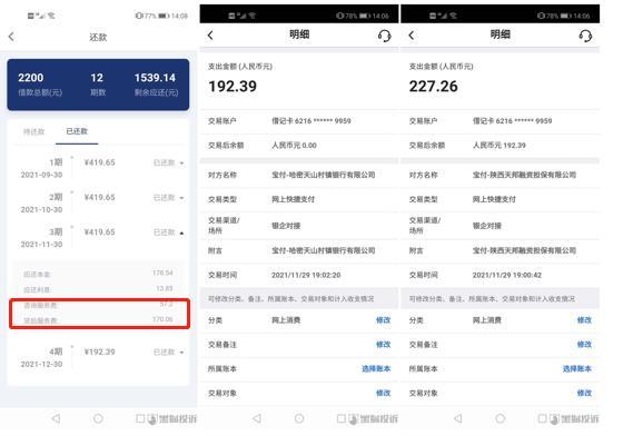 记者从两位网友的账单注意到,傅先生前两月的还款额度,已经达到了借款额度的41.4%;A先生前三月的还款额度,已经达到了借款额度的51.7%。具体而言,A先生一年下来被收取的服务费竟然比利息还高:利息是166.2元,服务费是681.78元。