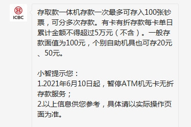 ATM机存款时一次性最多可以存入100张钞票,可以分为多次存款。有卡有存折每卡当日累计金额不可以超过5万元(不含),一般存款面值是100元,但是也有个别的ATM机可以存20万和50元。从2021年6月10号起,ATM机会暂停无卡无存折存款服务,具体恢复时间则需要以实际操作页面为准。