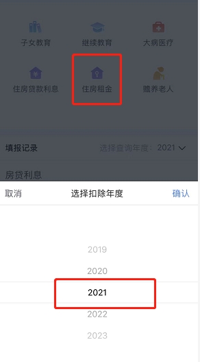 【2】页面跳转之后选择“住房租金”,并选择扣除年度为“2021”;