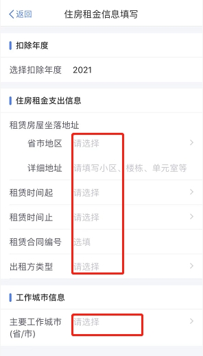 需要注意的是,在填写工作城市的时候必须和租赁房屋地址是一致的。另外若是用户已经填报同一扣除年度的住房贷款利息支出专项附加扣除的,就不能申报住房租金支出专项附加扣除了。