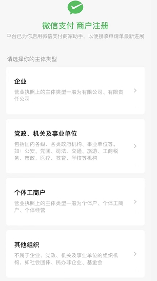 (2)然后在页面选择自己的商家主体类型,包括有企业、个体工商户、其他组织、小微商户、党政、机关及事业单位等主体类型可以选择;