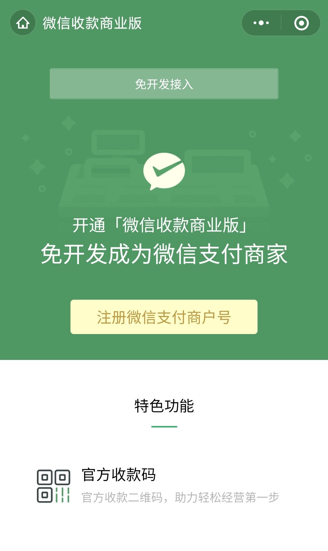 【2】进入到【微信收款商业版】小程序后,点击中间按钮【注册微信支付商户号】,完善商家各项信息,即可办理。