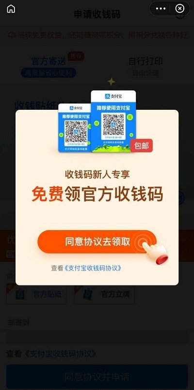 【2】点击“商家收钱”下面的“立即申请”。可以看到,新人专享福利,免费领取,只需要“同意协议并领取就好”。