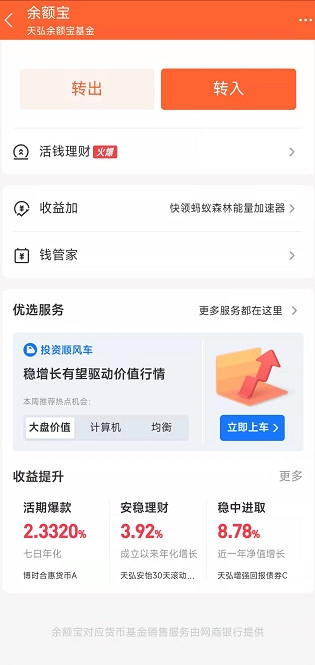 余额宝是支付宝中很火的一个产品,资金转入进去之后就可以每天赚取利息,灵活取用支持随存随取。余额宝对接的是货币基金,虽然收益很低,但是很稳定,比银行活期存款利率还要高一些。