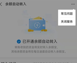 【4】未开通的用户就可以点击开通自动转入服务,开通想要关闭的用户就可以继续点击右上角的“…”,然后选择“关闭服务”即可关闭余额自动转入余额宝。