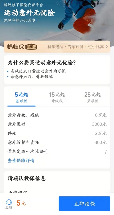 滑雪保险指的是众安保险联合蚂蚁保推出的运动意外无忧险,用户想要购买该款保险的话,可直接在支付宝上进行投保。也就是说,这款运动无忧意外险就是在支付宝平台上销售的一款意外险,背后的承保公司是众安保险。
