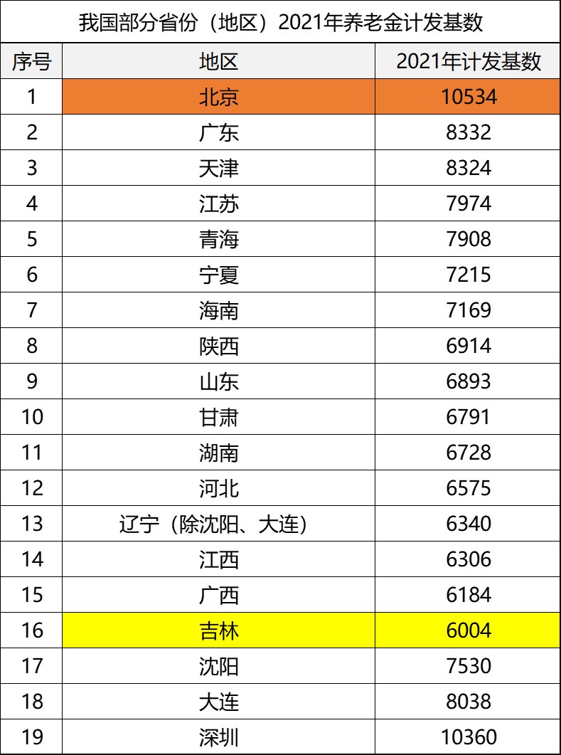 从上表可以看出:北京和深圳的养老金计发基数突破万元,北京为10534元。深圳为10360元。吉林的养老金计发基数最低,为6004元。