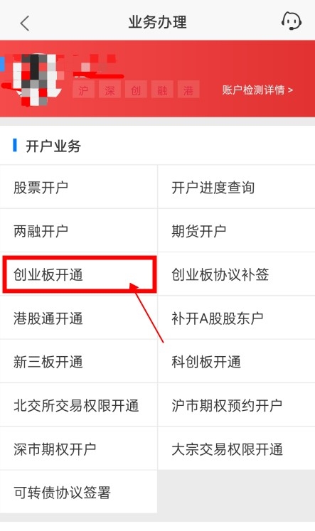 ②进入业务办理后,在开户业务下方,找到“创业板开通”。