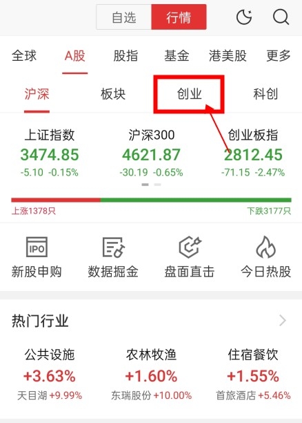 ②进入行业页面之后,选择上方的“创业”就可以找到创业板的股票了,或者我们有明确的目标,也可以直接在搜索栏输入股票名称或是代码进行买入。
