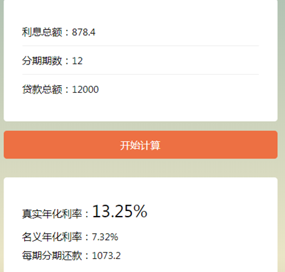 看似年利率不高,但实际上真实费率要高很多,小编用贷款计算器计算了一下,发现实际年利率为13.25%,看完是不是吓了你一跳?